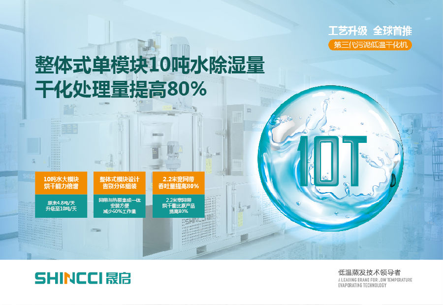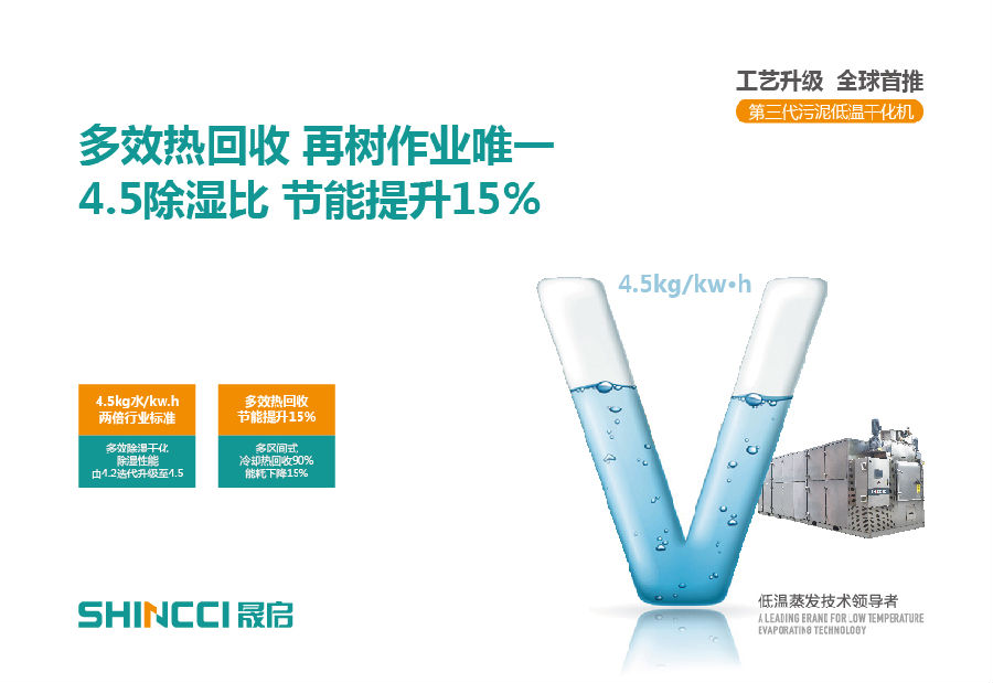 In 2020, Shincci's third-generation low-temperature sludge dryer, first launched in the world, mainly include SHS series integrated sludge low-temperature belt dryer, MHR series multifunctional heat recovery integrated sludge low-temperature belt dryer, etc. , which adopt multi-effect heat recovery technology, available to reach 4.5 dehumidification ratio, and their energy saving performance will be increase by 15%.