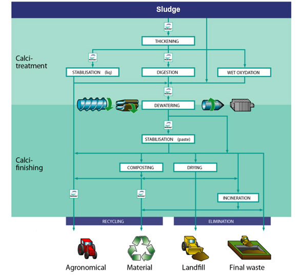 Sludge need to be treated, involving multi-process solutions. Sludge are stabilized in order to control the degradation of organic ingredients and to remove odors, their volume is reduced, and they are hygienized (pathogen organisms are eliminated).