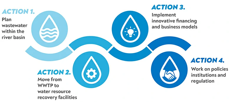 ACTION 1: Develop wastewater initiatives as part of a basin planning framework to maximize benefits, improve efficiency and resource allocation, and engage stakeholders. There is a need to move from ad hoc and isolated wastewater solutions (such as one treatment plant per municipality) to fully integrated river basin planning approaches, which yield more sustainable and resilient systems. Planning and analyzing water quality and quantity at the basin level makes possible integrated solutions that are more financially, socially, economically, and environmentally sustainable. Basin planning allows for the optimal deployment of facilities and sanitation programs, including the location, timing, and phasing of treatment infrastructure. It enables decision makers to set priorities for investment planning and action. The basin planning framework also allows for more efficient investments, through the design of effluent standards based on the specific contexts of particular water bodies and ecosystems instead of uniform or arbitrary water pollution control standards. Moreover, including wastewater in the hydrological system as a potential water source makes it possible to account and plan for wastewater reuse, limiting incidental and unplanned water reuse that can have negative health and environmental consequences.