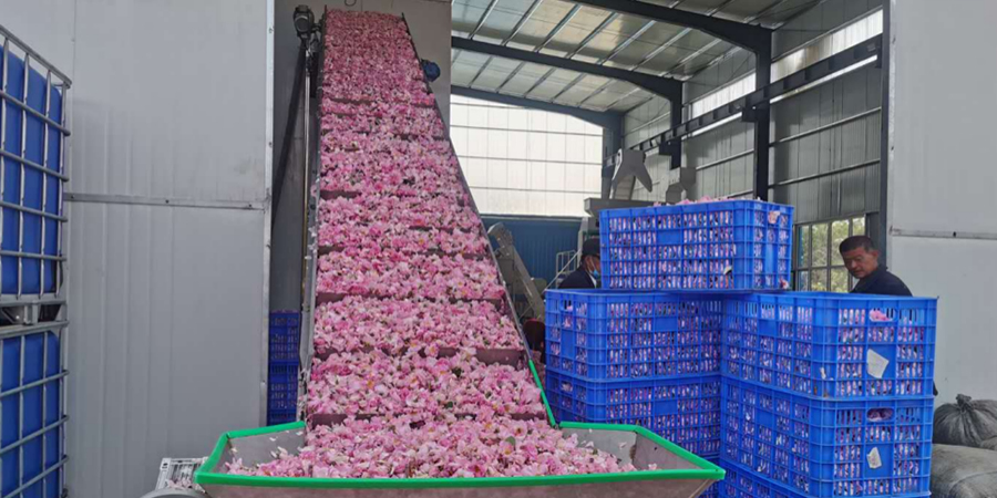 The base purchased flowers based on the guaranteed price of 10 CNY / kg, which effectively solved the market problem for local people. After receiving a stack of hundred-dollar bills, the growers were filled with the joy of harvest. The staffs were busy with weighing and inspecting the flowers, and then spread them in the shade to hang and cool. The wide workshop immediately became a sea of roses. They are about to meet the next beautiful transformation.