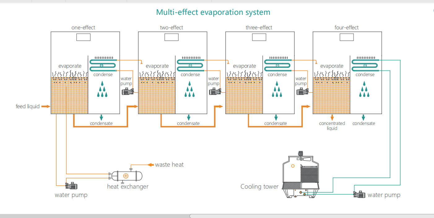 ④ After concentration by three-effect evaporation, the feed liquid enters the four-effect evaporation chamber. The four-effect feed liquid is heated by the four-effect heater and then boils and evaporates. The low temperature steam is cooled into condensate water by the cooler and discharged outside the machine;