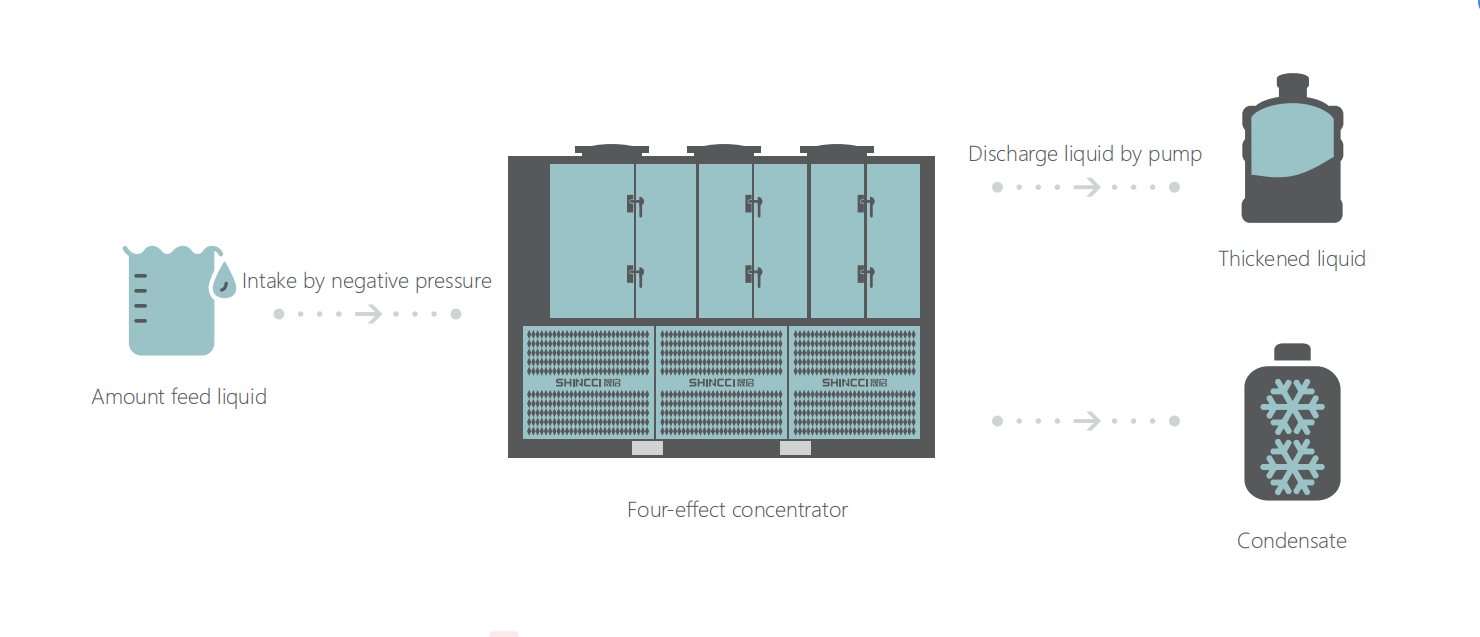 A large amount of feed liquid is intake by the concentrator machine under negative pressure, and a small amount of thickened liquid is discharged by pump after treatment; condensed water is forced out by the water pump.