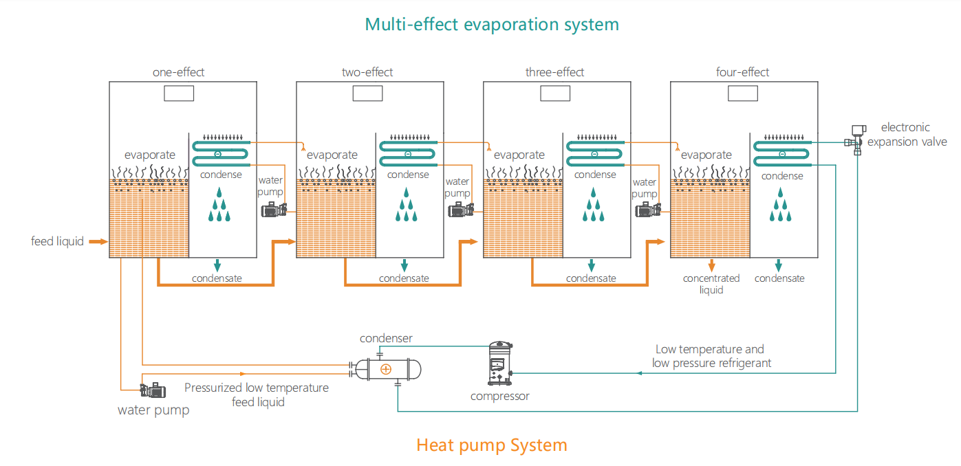 ④ After thickened by three-effect evaporation, the feed liquid enters the four-effect evaporation chamber. The four-effect feed liquid is heated by the four-effect heater and then boils and evaporates. The low-temperature vapor is cooled into condensate by the heat pump evaporator and discharged outside the machine.