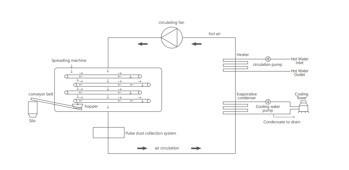 The biomass low-temperature waste heat dryer independently developed by Shincci Energy uses waste hot water, steam and other heat sources to heat, and then uses cooling water to condense and dehumidify. Wet materials are dehydrated and dried, which is suitable for drying light materials and avoiding dust. The whole system is fully enclosed design, dry hot air without heat loss. The unit adopts a pulse dust removal system and an automatic dust collection device, which is suitable for drying light materials with a lot of dust.