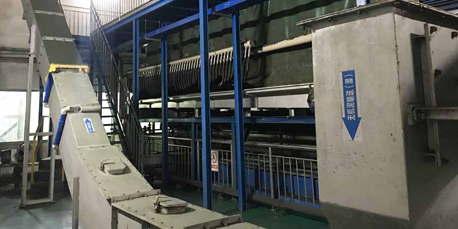 45 tons of inorganic sludge is discharged from the plate and frame machine. The sludge with 80±2% moisture content is fed into the 4.5m³ buffer silo through the spiral + horizontal summary scraper + lifting scraper, and then transported to the dryer by the shaftless screw conveyor at the bottom of the silo.