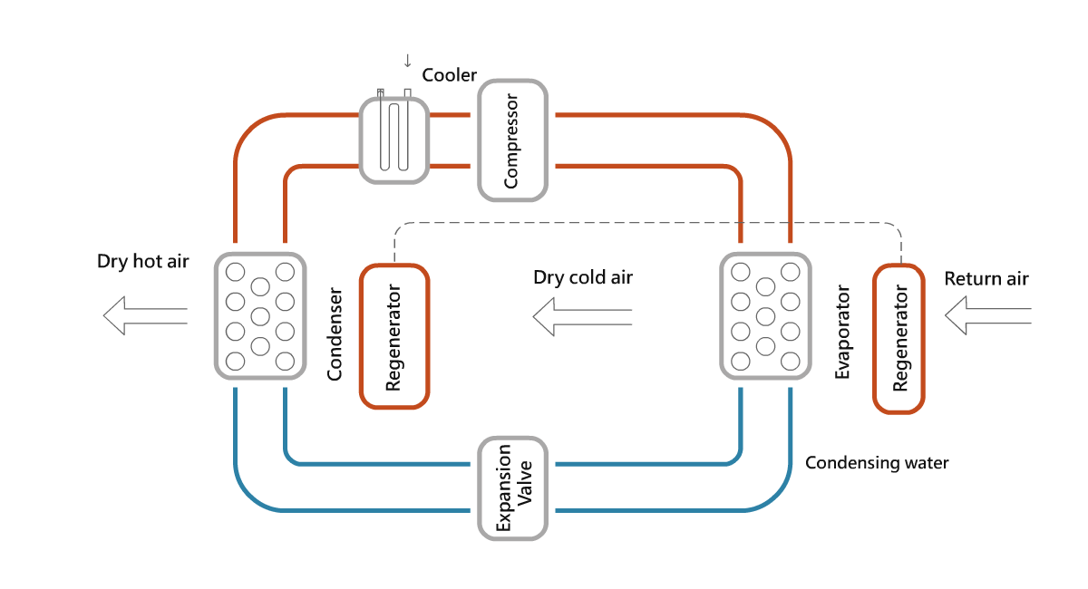 The energy consumed during the process is only the electricity needed to operate the compressors and the fans or air handlers.